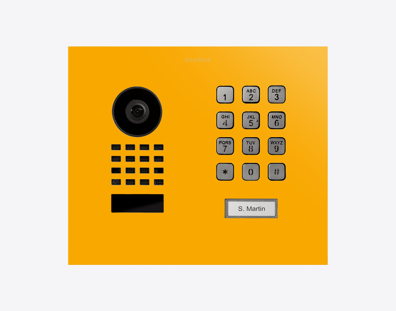 The durable Doorbird D1101KH-M-F 423880047, MODERN FLUSH-MOUNT IP VIDEO DOOR STATION, RAL 1003, stainless steel, powder-coated, semi-gloss, is for single-family homes and businesses with 1 unit, and 1 call button.