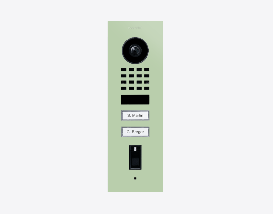 The durable D1102FV-F, FINGERPRINT 50 FLUSH-MOUNT IP VIDEO DOOR STATION, RAL 6019, stainless steel, powder-coated, semi-gloss, is for multi-tenant buildings and businesses with 2 units, and 2 call buttons.