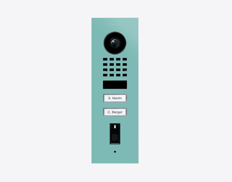 The durable D1102FV-F 423895379, FINGERPRINT 50 FLUSH-MOUNT IP VIDEO DOOR STATION, RAL 6027, stainless steel, powder-coated, semi-gloss, is for multi-tenant buildings and businesses with 2 units, and 2 call buttons.