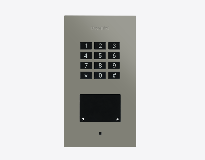 The durable Doorbird A1121-F 423894006, FLUSH-MOUNT IP ACCESS CONTROL DEVICE, RAL 7023, stainless steel, powder-coated, semi-gloss is a multi-technology access control system and stand-alone solution for back and side doors, garages, storage and packing rooms, and bicycle and machine rooms.