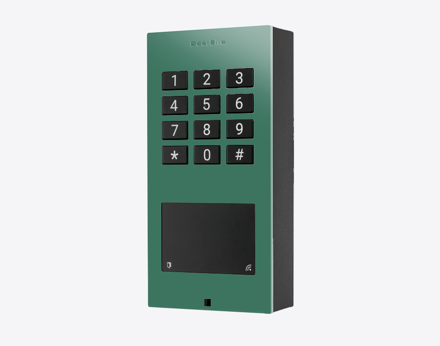 The versatile Doorbird A1121-S 423893399, SURFACE-MOUNT IP ACCESS CONTROL DEVICE, RAL 6000, stainless steel, powder-coated, semi-gloss is a multi-technology access control system and stand-alone solution for back and side doors, garages, storage and packing rooms, bicycle, and machine rooms.