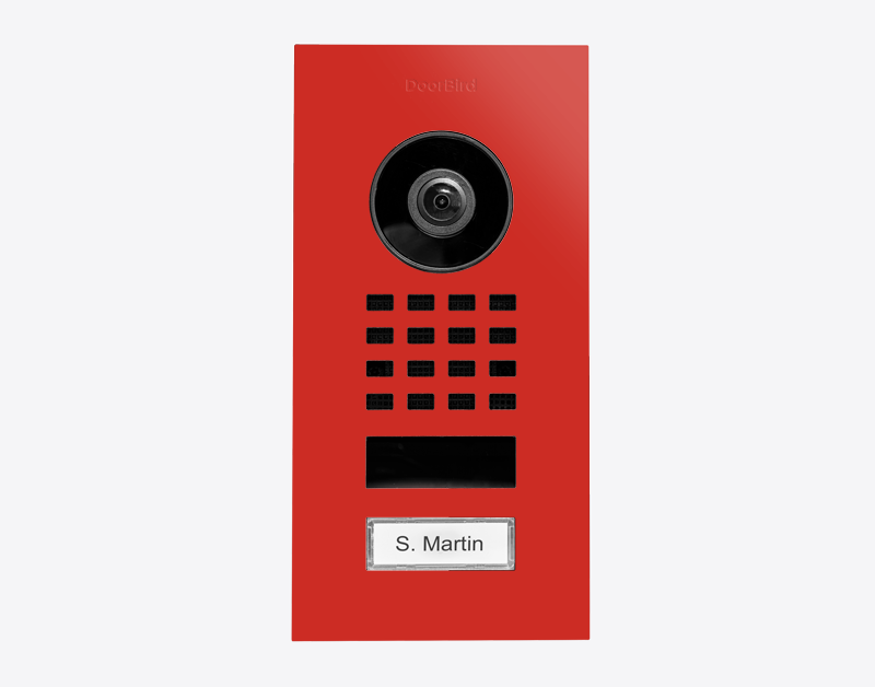 The durable Doorbird D1101V-F 423878648, FLUSH-MOUNT IP VIDEO DOOR STATION, RAL 3028, stainless steel, powder-coated, semi-gloss, is for single-family homes and businesses with 1 unit, and 1 call button.