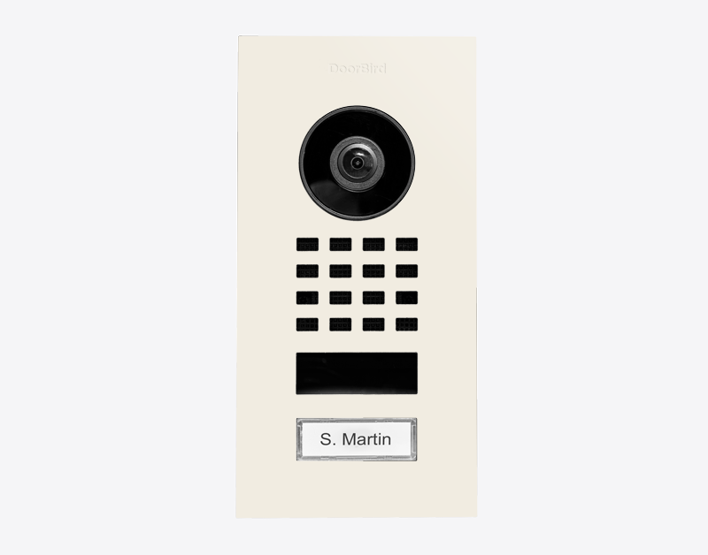 The durable Doorbird 423878785 D1101V-F, FLUSH-MOUNT IP VIDEO DOOR STATION, RAL 9010, stainless steel, powder-coated, semi-gloss for single-family homes and businesses with 1 unit, and 1 call button.