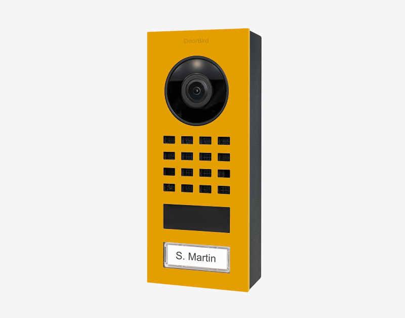 The durable Doorbird 423878310 D1101V-S, SURFACE-MOUNT IP VIDEO DOOR STATION, RAL 1004, stainless steel, powder-coated, semi-gloss, is for single-family homes and businesses with 1 unit, 1 call button.