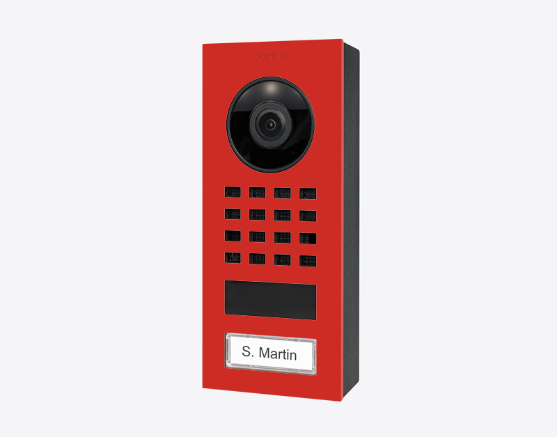 The efficient Doorbird 423878280 D1101V-S, SURFACE-MOUNT IP VIDEO DOOR STATION, RAL 3028, stainless steel, powder-coated, semi-gloss, for single-family homes and businesses with 1 unit, 1 call button.