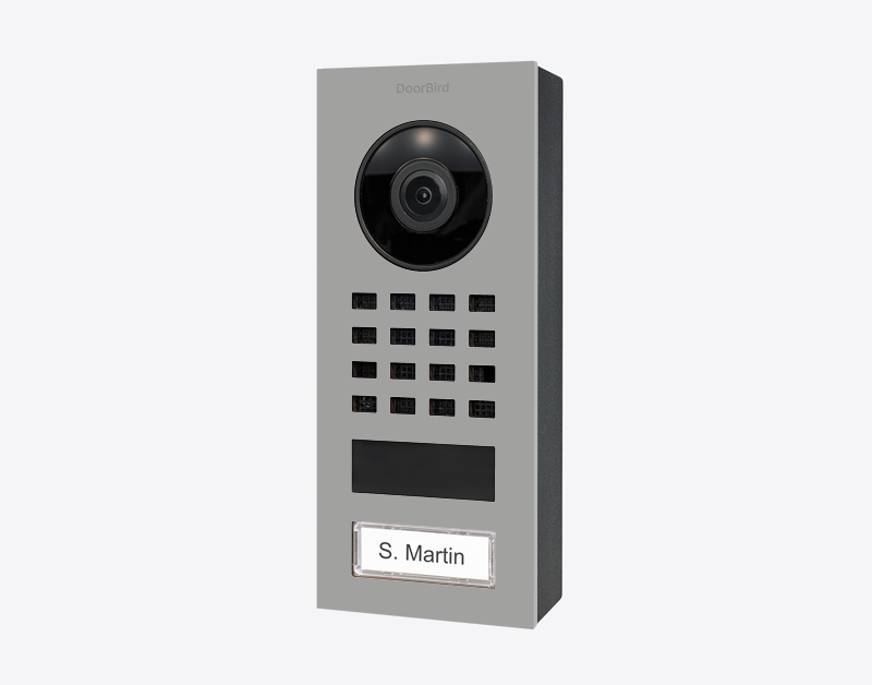 The efficient Doorbird 423878419 D1101V-S, SURFACE-MOUNT IP VIDEO DOOR STATION, RAL 9006, stainless steel, powder-coated, semi-gloss, is for single-family homes and businesses with 1 unit, and 1 call button.