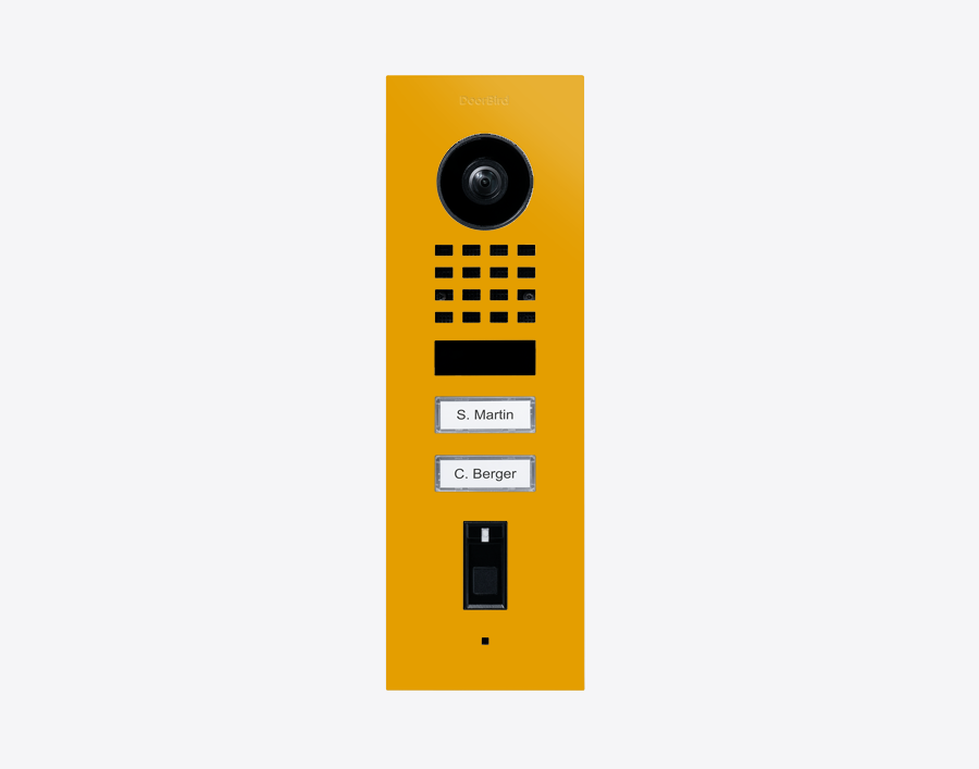 The durable Doorbird D1102FV-F 423895294, FINGERPRINT 50 FLUSH-MOUNT IP VIDEO DOOR STATION, RAL 1004, stainless steel, powder-coated, semi-gloss, is for multi-tenant buildings and businesses with 2 units, and 2 call buttons.