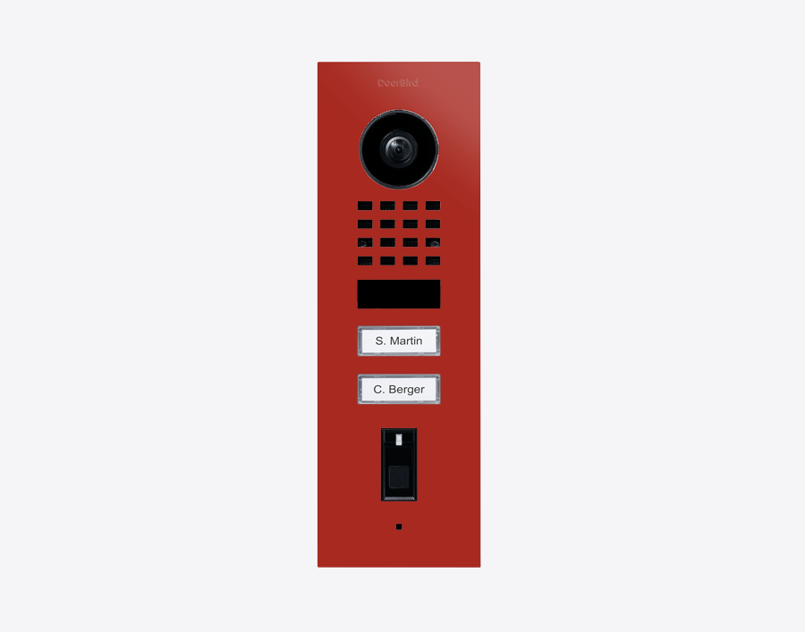 The durable Doorbird D1102FV-F 423895331, FINGERPRINT 50 FLUSH-MOUNT IP VIDEO DOOR STATION, RAL 3000, stainless steel, powder-coated, semi-gloss, is for multi-tenant buildings and businesses with 2 units, and 2 call buttons.