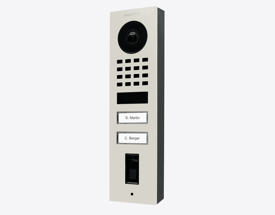 The durable Doorbird D1102FV-S 423895201, FINGERPRINT 50 SURFACE-MOUNT IP VIDEO DOOR STATION, RAL 9002, stainless steel, powder-coated, semi-gloss, is for multi-tenant buildings and businesses with 2 units, and 2 call buttons.