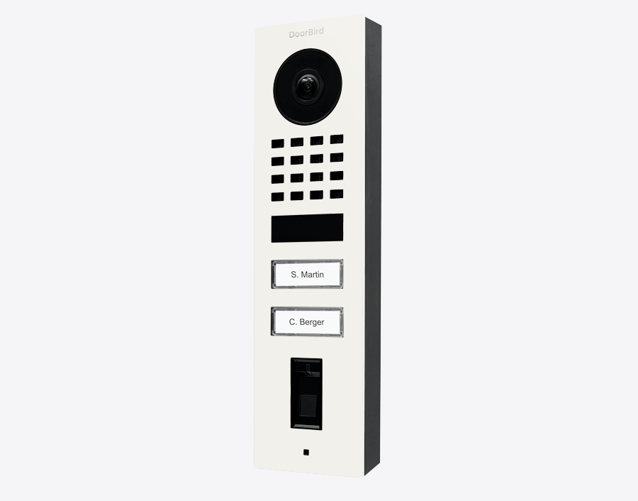 The durable Doorbird 423873568 D1102FV-S, FINGERPRINT 50 SURFACE-MOUNT IP VIDEO DOOR STATION, RAL 9016, stainless steel, powder-coated, semi-gloss, is for multi-tenant buildings and businesses with 2 units, and 2 call buttons.