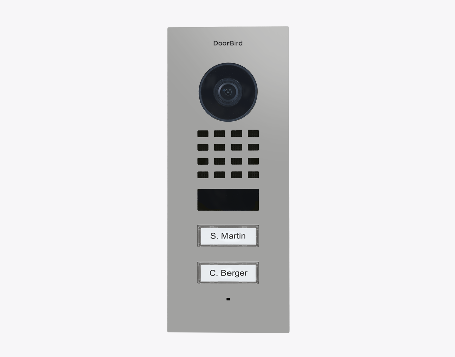 The durable Doorbird 423878952 D1102V-F, FLUSH-MOUNT IP VIDEO DOOR STATION, RAL 9006, stainless steel, powder-coated, semi-gloss is for multi-tenant buildings and businesses with 2 units, and 2 call buttons.