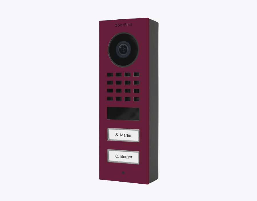 The durable Doorbird 423878556 D1102V-S, SURFACE-MOUNT IP VIDEO DOOR STATION, RAL 4004, stainless steel, powder-coated, semi-gloss, for multi-tenant buildings and businesses with 2 units, and 2 call buttons.