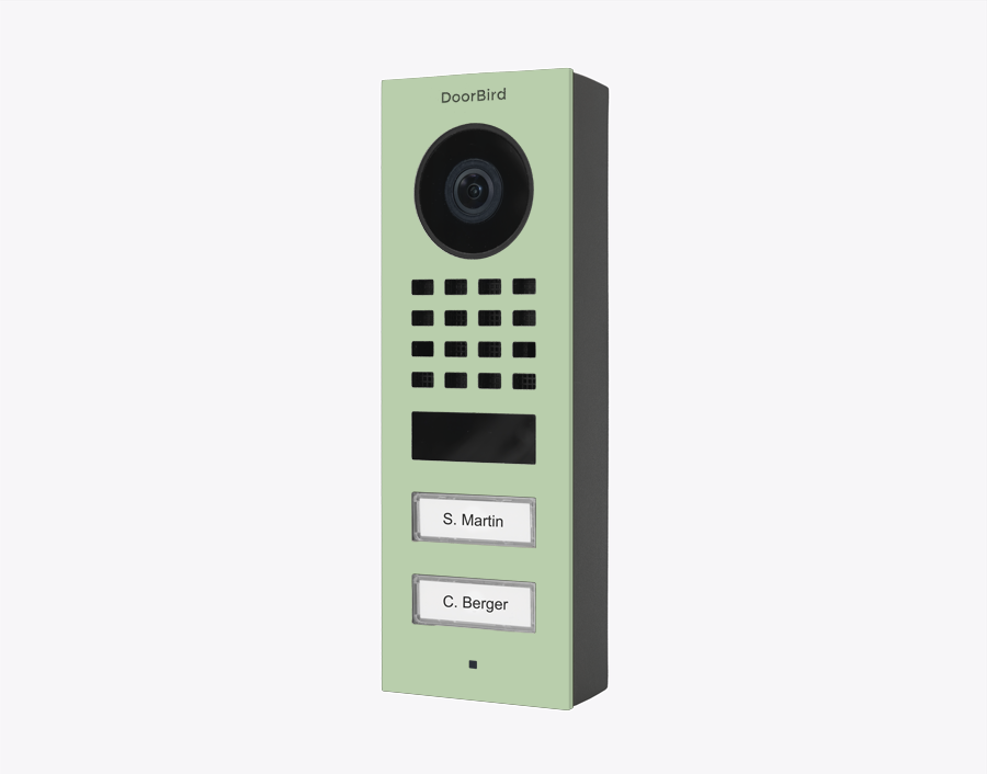 The durable Doorbird D1102V-S 423878563, SURFACE-MOUNT IP VIDEO DOOR STATION, RAL 6019, stainless steel, powder-coated, semi-gloss, is for multi-tenant buildings and businesses with 2 units, and 2 call buttons