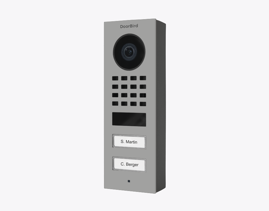 The durable Doorbird 423878594 D1102V-S, SURFACE-MOUNT IP VIDEO DOOR STATION, RAL 9006, stainless steel, powder-coated, semi-gloss is a multi-tenant building and businesses with 2 units, 2 call buttons.