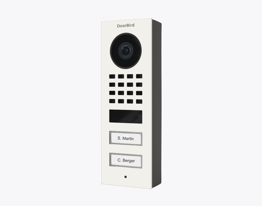 The durable Doorbird 423873476 D1102V-S, SURFACE-MOUNT IP VIDEO DOOR STATION, RAL 9016, stainless steel, powder-coated, semi-gloss for multi-tenant buildings and businesses with 2 units, 2 call buttons.