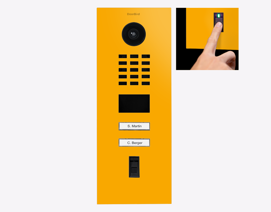The efficient Doorbird D2102FV-FP50 423896710, FINGERPRINT 50 IP VIDEO DOOR STATION, RAL 1003, stainless steel, powder-coated, semi-gloss is for multi-tenant buildings and businesses with 2 units, and 2 call buttons.