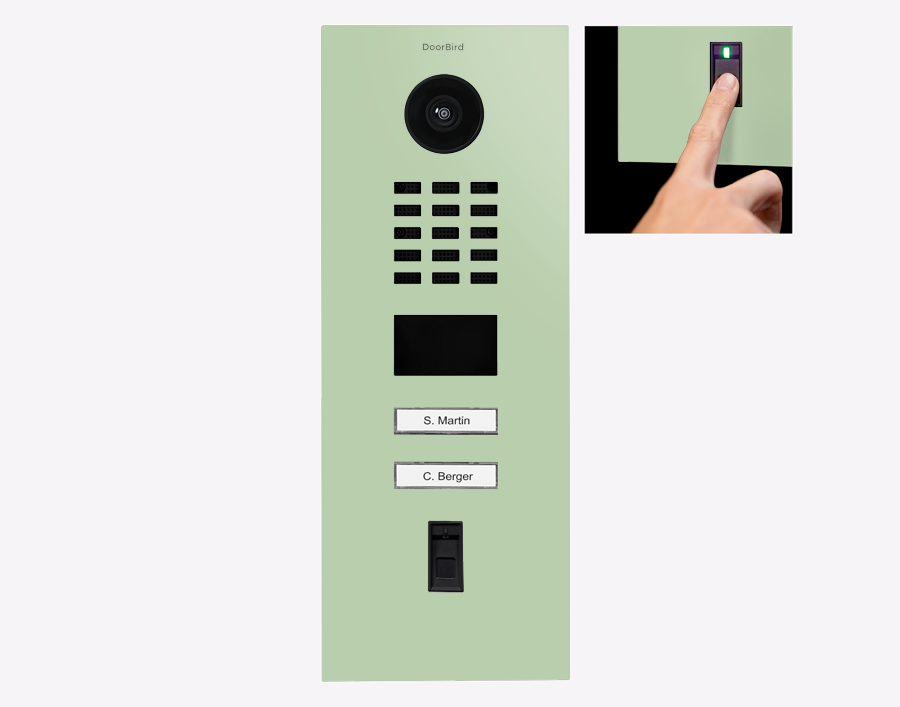 Doorbird D2102FV-FP50, FINGERPRINT 50 IP VIDEO DOOR STATION, RAL 6019, stainless steel, powder-coated, semi-gloss. Part# 423896956