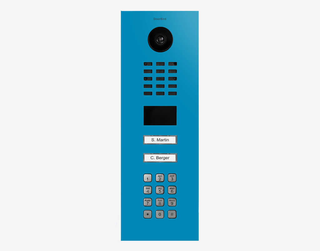 The efficient Doorbird D2102KV 423891319, IP VIDEO DOOR STATION, RAL 5012, stainless steel, powder-coated, semi-gloss is for multi-tenant buildings and businesses with 2 units, and 2 call buttons.