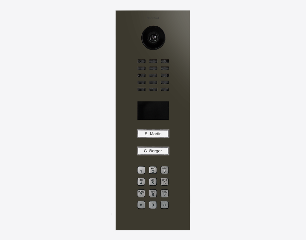 The efficient Doorbird D2102KV 423891364, IP VIDEO DOOR STATION, RAL 6006, stainless steel, powder-coated, semi-gloss is for multi-tenant buildings and businesses with 2 units, and 2 call buttons.