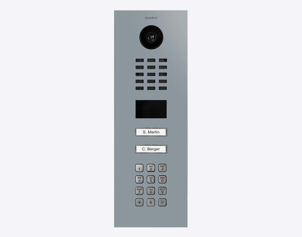 The durable Doorbird D2102KV 423891401, IP VIDEO DOOR STATION, RAL 7001, stainless steel, powder-coated, semi-gloss is for multi-tenant buildings and businesses with 2 units, and 2 call buttons.