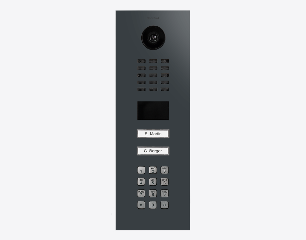 The efficient Doorbird D2102KV 423871250, IP VIDEO DOOR STATION, RAL 7016, stainless steel, powder-coated, semi-gloss is for multi-tenant buildings and businesses with 2 units, and 2 call buttons.