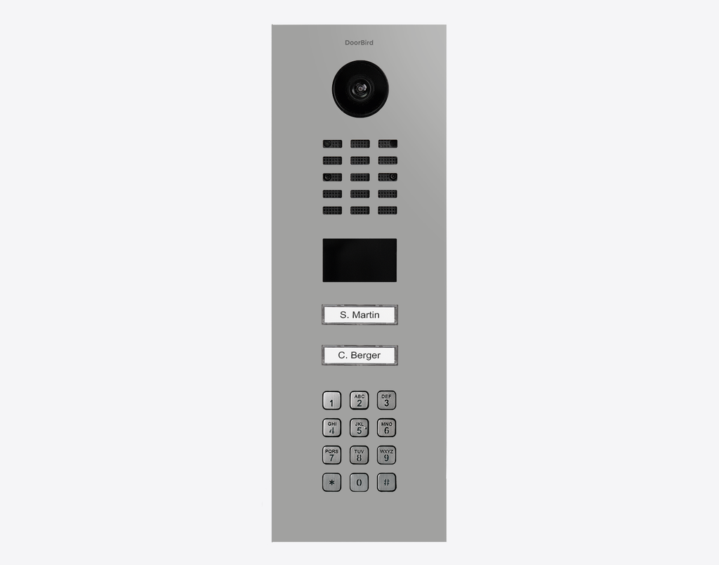 The advanced Doorbird D2102KV 423891548, IP VIDEO DOOR STATION, RAL 9006, stainless steel, powder-coated, semi-gloss is for multi-tenant buildings and businesses with 2 units, and 2 call buttons.