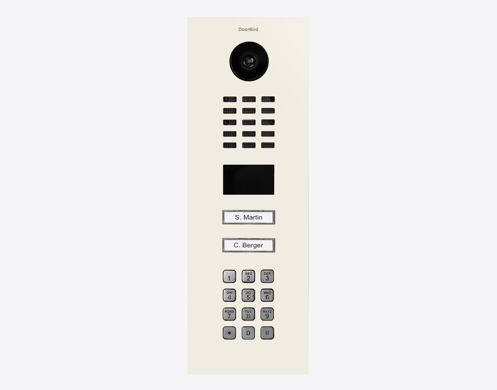 The durable Doorbird D2102KV 423891562, IP VIDEO DOOR STATION, RAL 9010, stainless steel, powder-coated, semi-gloss is for multi-tenant buildings and businesses with 2 units, and 2 call buttons.