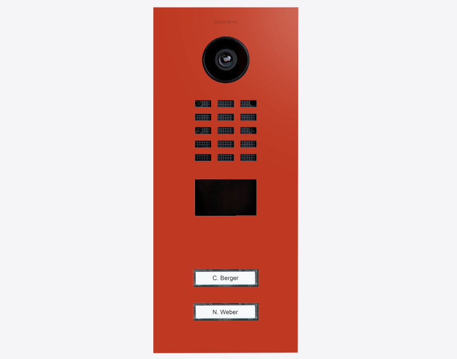 The durable Doorbird 423885462 D2102V, IP VIDEO DOOR STATION, RAL 2002, stainless steel, powder-coated, semi-gloss, for multi-tenant buildings and businesses with 2 units, and 2 call buttons.