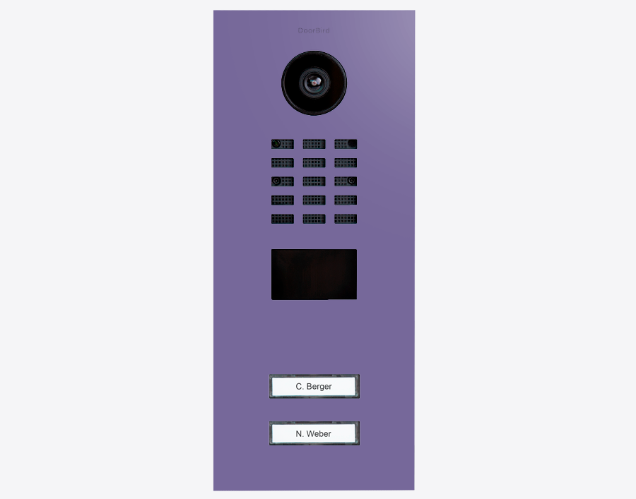 The durable Doorbird 423885530 D2102V, IP VIDEO DOOR STATION, RAL 4005, stainless steel, powder-coated, semi-gloss, is for multi-tenant buildings and businesses with 2 units, and 2 call buttons.