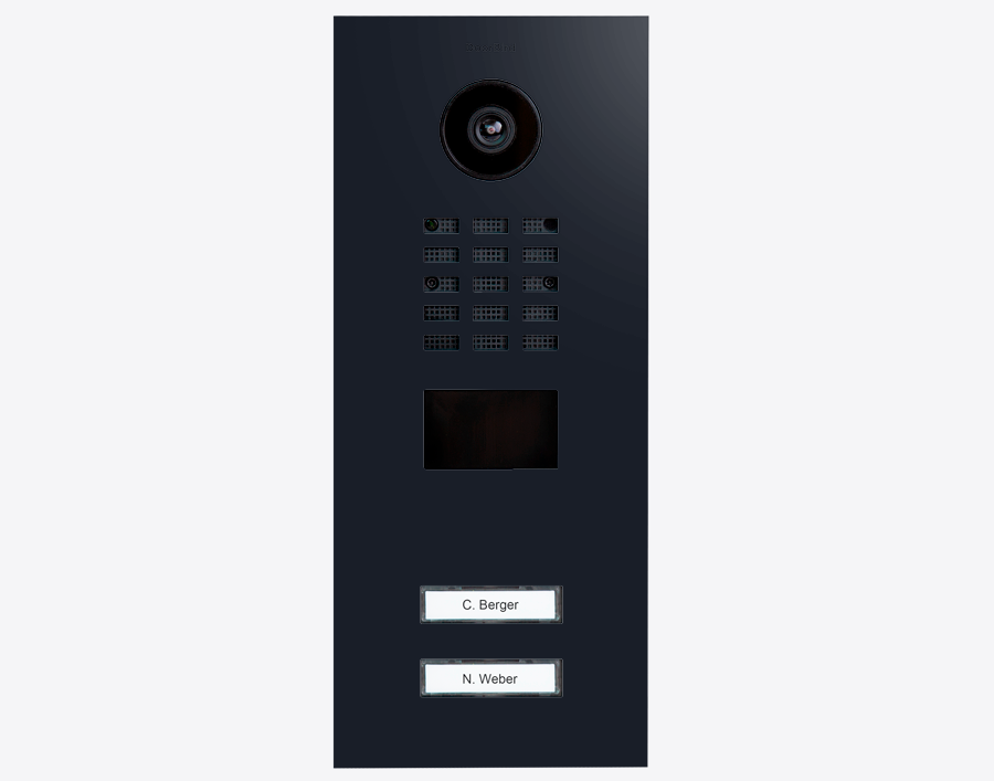 The durable Doorbird D2102V 423885578, IP VIDEO DOOR STATION, RAL 5004, stainless steel, powder-coated, semi-gloss, is for multi-tenant buildings and businesses with 2 units, and 2 call buttons.