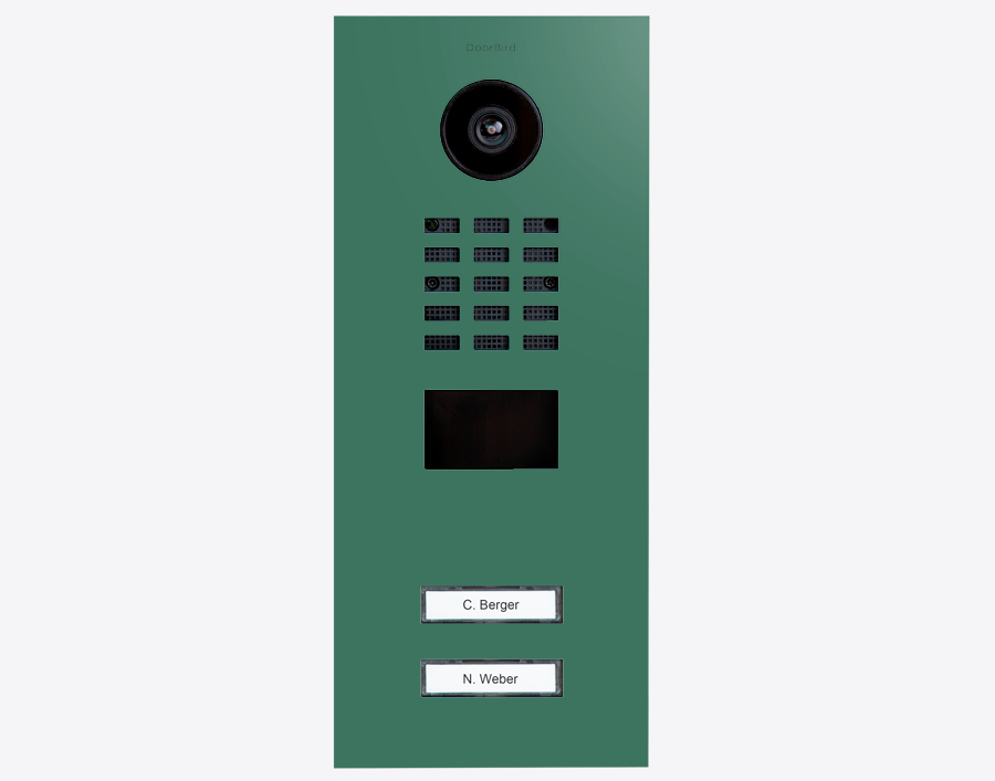 The durable Doorbird 423885622 D2102V, IP VIDEO DOOR STATION, RAL 6000, stainless steel, powder-coated, semi-gloss, is for multi-tenant buildings and businesses with 2 units, and 2 call buttons.