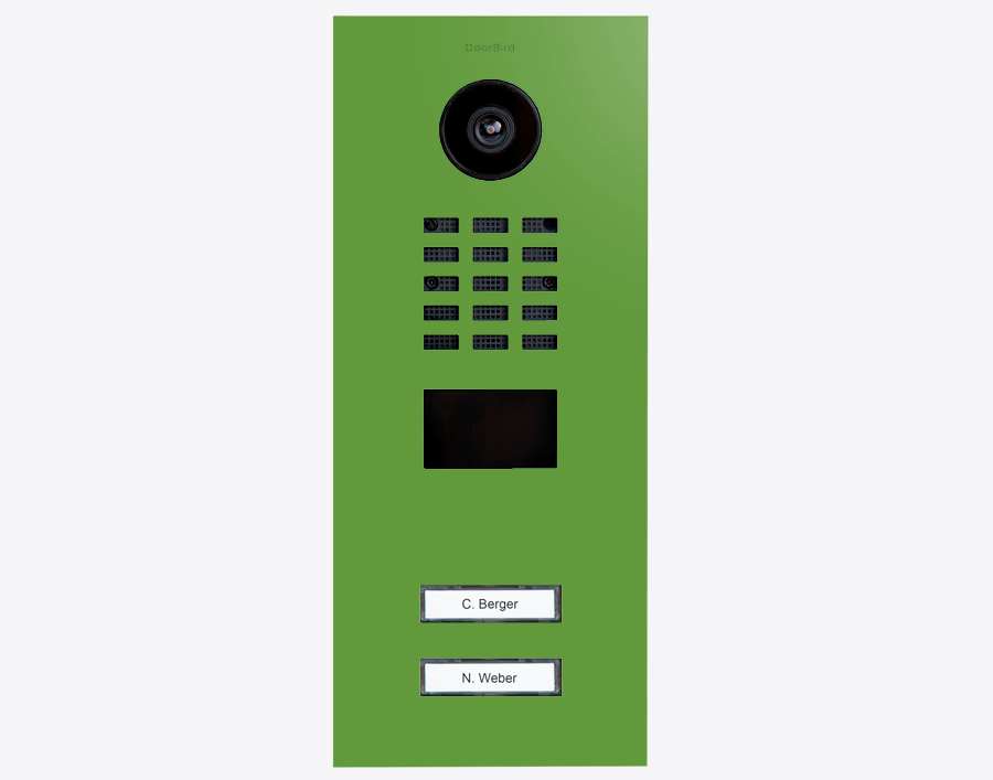 The durable Doorbird 423885646 D2102V, IP VIDEO DOOR STATION, RAL 6018, stainless steel, powder-coated, semi-gloss, is for multi-tenant buildings and businesses with 2 units, and 2 call buttons.