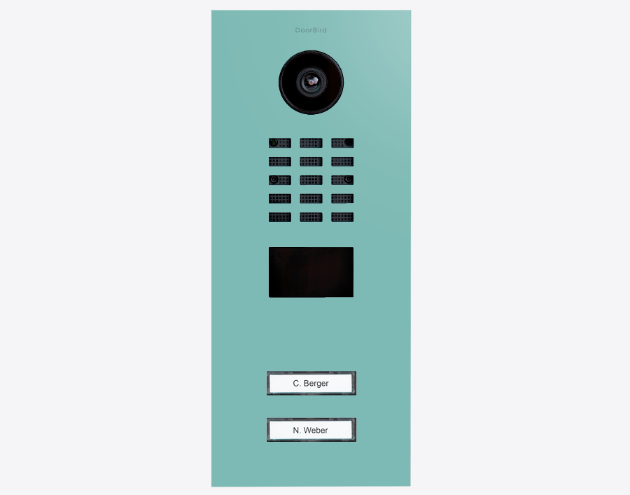 The durable Doorbird D2102V 423885660 IP VIDEO DOOR STATION, RAL 6027, stainless steel, powder-coated, semi-gloss, is for multi-tenant buildings and businesses with 2 units, and 2 call buttons.