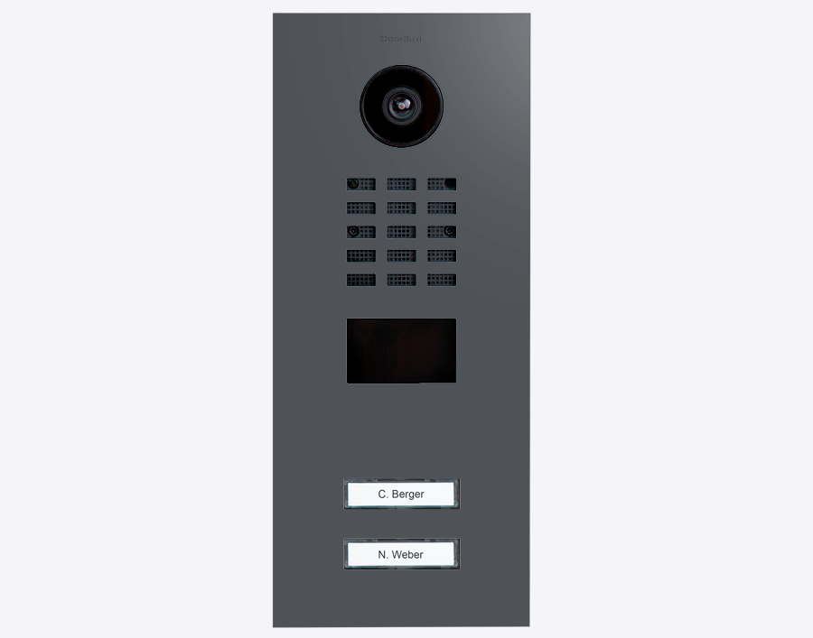 The durable Doorbird D2102V 423885714, IP VIDEO DOOR STATION, RAL 7015, stainless steel, powder-coated, semi-gloss, is for multi-tenant buildings and businesses with 2 units, and 2 call buttons.