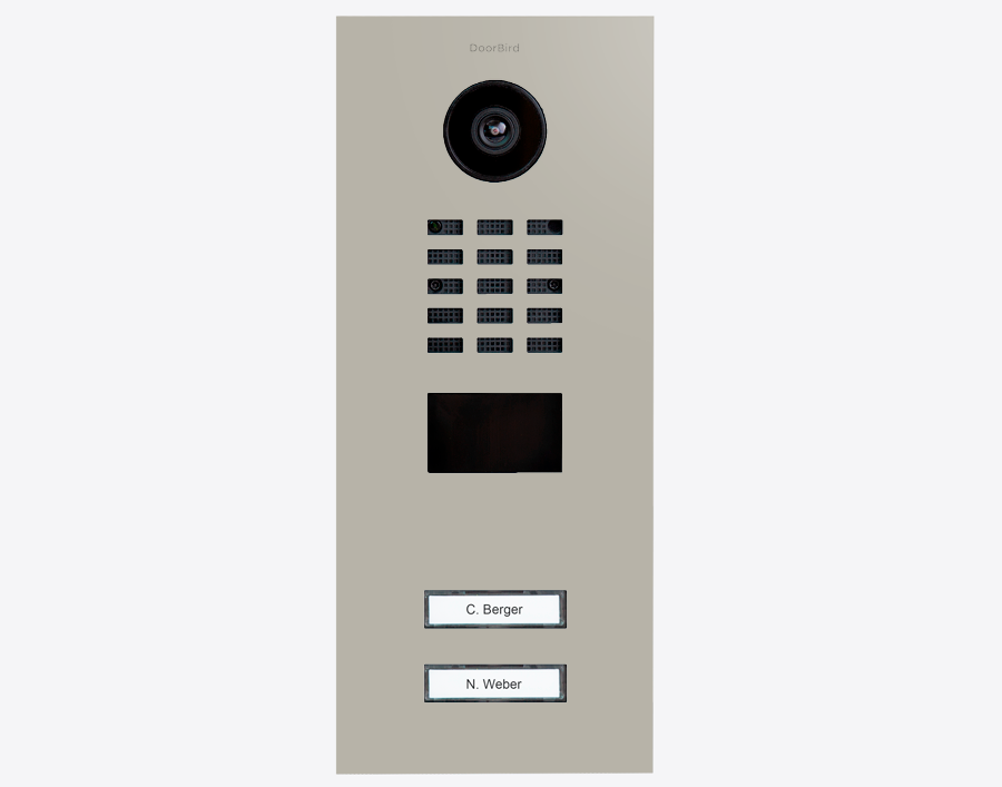 The durable Doorbird 423885745 D2102V, IP VIDEO DOOR STATION, RAL 7044, stainless steel, powder-coated, semi-gloss, is for multi-tenant buildings and businesses with 2 units, and 2 call buttons.