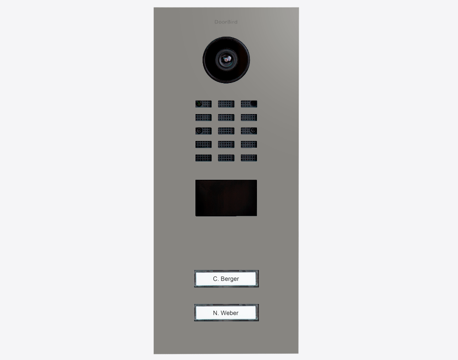 The durable Doorbird D2102V 423885820, IP VIDEO DOOR STATION, RAL 9007, stainless steel, powder-coated, semi-gloss, for multi-tenant buildings and businesses with 2 units, and 2 call buttons.