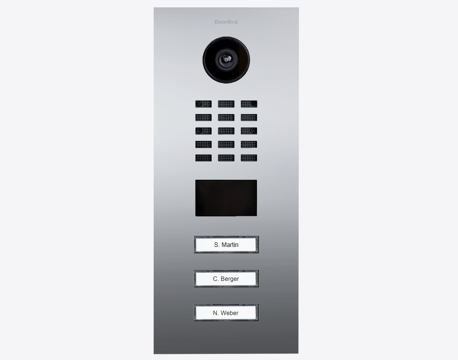 The durable Doorbird D2103V 423885899, IP VIDEO DOOR STATION, Chrome-finish as PVD coating, stainless steel V4A, high-gloss polished, is for multi-tenant buildings and businesses with 3 units, and 3 call buttons.