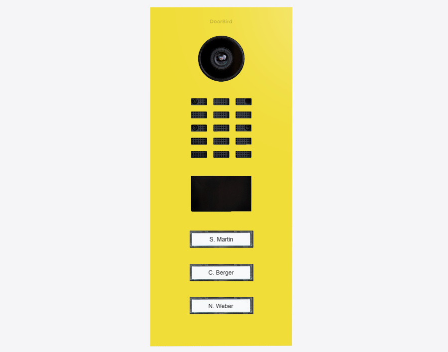 The durable Doorbird 423885943 D2103V, IP VIDEO DOOR STATION, RAL 1016, stainless steel, powder-coated, semi-gloss, is for multi-tenant buildings and businesses with 3 units, and 3 call buttons.