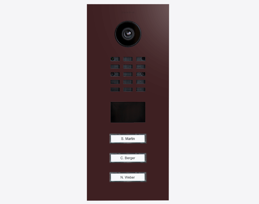The durable Doorbird D2103V 423886001, IP VIDEO DOOR STATION, RAL 3007, stainless steel, powder-coated, semi-gloss, is for multi-tenant buildings and businesses with 3 units, and 3 call buttons.