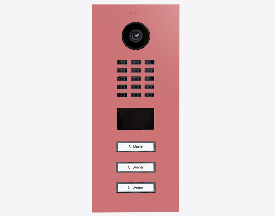 The durable Doorbird 423886018 D2103V, IP VIDEO DOOR STATION, RAL 3014, stainless steel, powder-coated, semi-gloss, is for multi-tenant buildings and businesses with 3 units, and 3 call buttons.