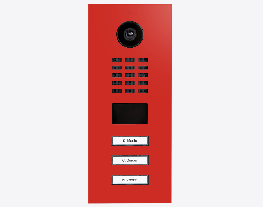 The durable Doorbird D2103V 423886025, IP VIDEO DOOR STATION, RAL 3028, stainless steel, powder-coated, semi-gloss, is for multi-tenant buildings and businesses with 3 units, and 3 call buttons.