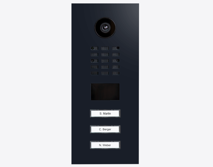 The advanced Doorbird 423886087 D2103V, IP VIDEO DOOR STATION, RAL 5004, stainless steel, powder-coated, semi-gloss, is for multi-tenant buildings and businesses with 3 units, and 3 call buttons.