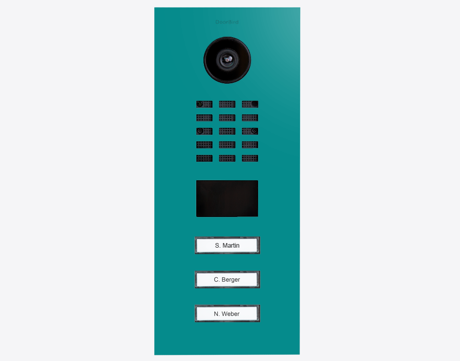 The durable Doorbird D2103V 423886117, IP VIDEO DOOR STATION, RAL 5018, stainless steel, powder-coated, semi-gloss, is for multi-tenant buildings and businesses with 3 units, and 3 call buttons.