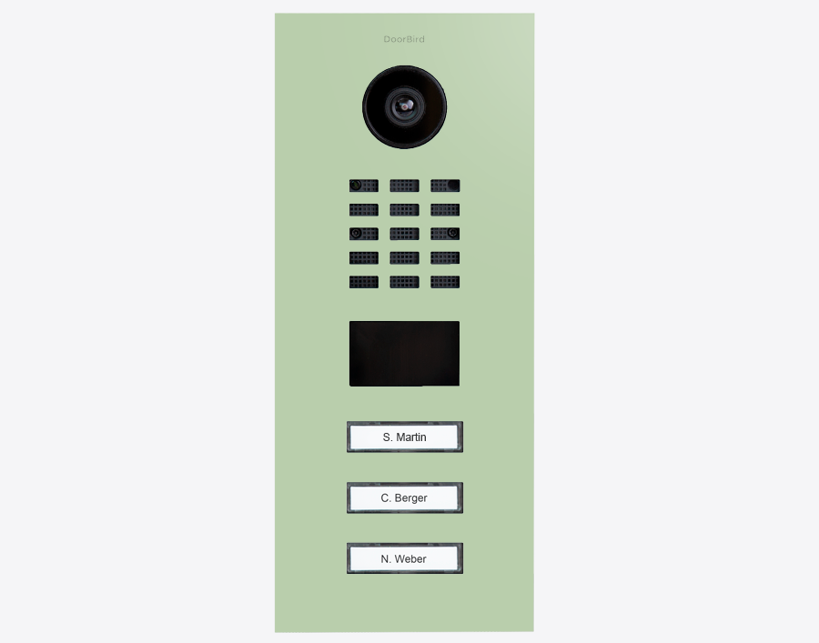 The durable Doorbird D2103V, 423886162 IP VIDEO DOOR STATION, RAL 6019, stainless steel, powder-coated, semi-gloss, is for multi-tenant buildings and businesses with 3 units, and 3 call buttons.