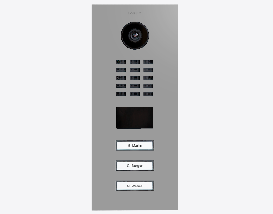 The advanced Doorbird D2103V 423886193, IP VIDEO DOOR STATION, RAL 7004, stainless steel, powder-coated, semi-gloss, is for multi-tenant buildings and businesses with 3 units, and 3 call buttons.