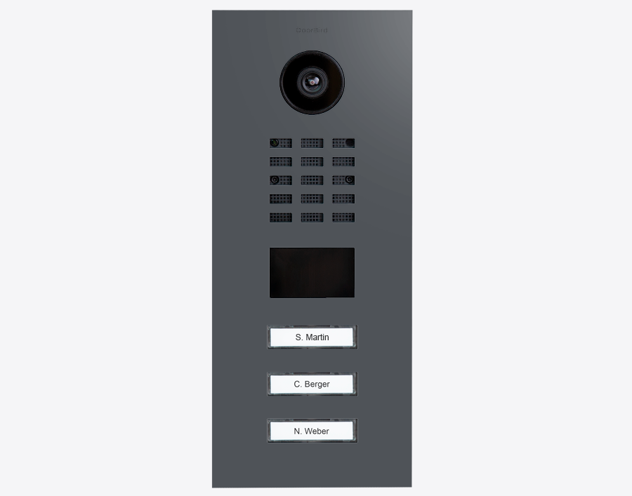 The durable Doorbird D2103V 423886223, IP VIDEO DOOR STATION, RAL 7015, stainless steel, powder-coated, semi-gloss, is for multi-tenant buildings and businesses with 3 units, and 3 call buttons.