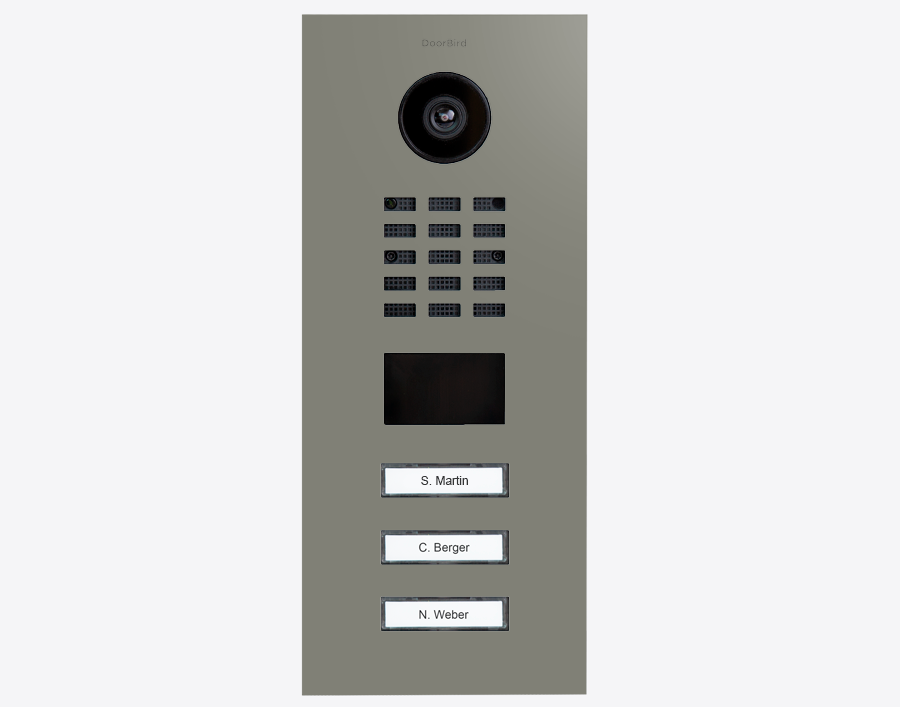 The durable Doorbird D2103V 423886230, IP VIDEO DOOR STATION, RAL 7023, stainless steel, powder-coated, semi-gloss, is a multi-tenant building and business with 3 units, and 3 call buttons.