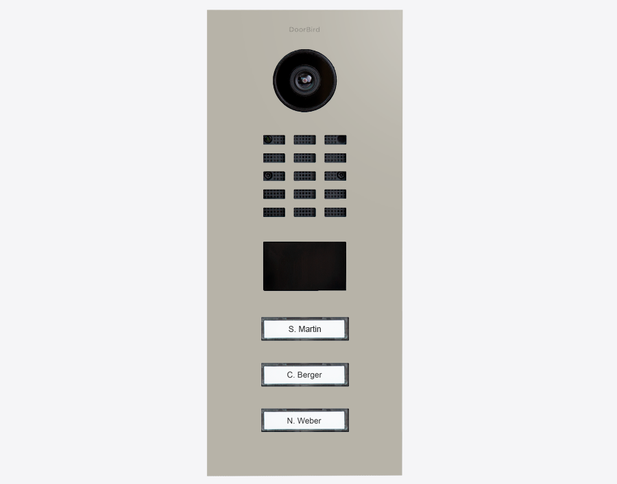 The durable Doorbird D2103V 423886254, IP VIDEO DOOR STATION, RAL 7044, stainless steel, powder-coated, semi-gloss, is for multi-tenant buildings and businesses with 3 units, and 3 call buttons.