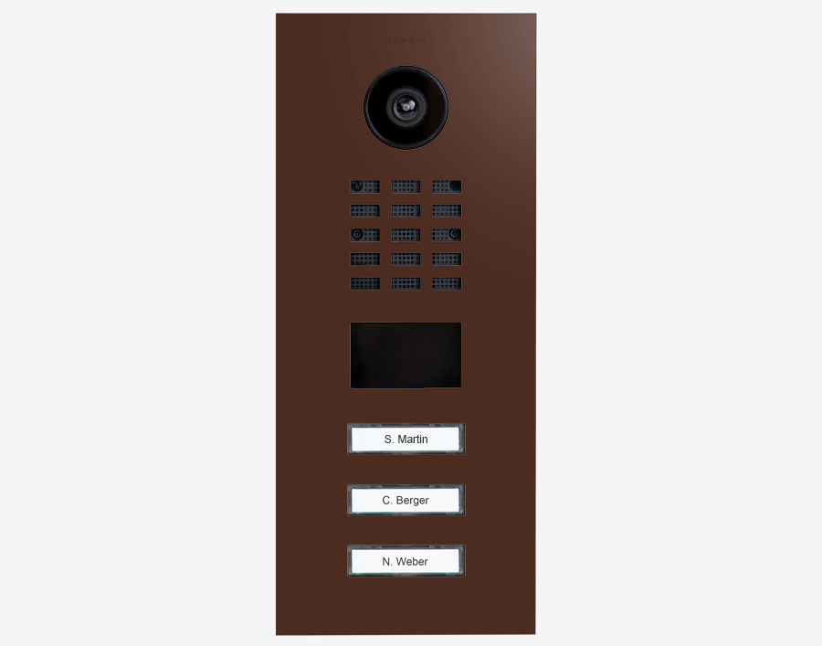 The durable Doorbird D2103V 423886285, IP VIDEO DOOR STATION, RAL 8016, stainless steel, powder-coated, semi-gloss, is for multi-tenant buildings and businesses with 3 units, and 3 call buttons.