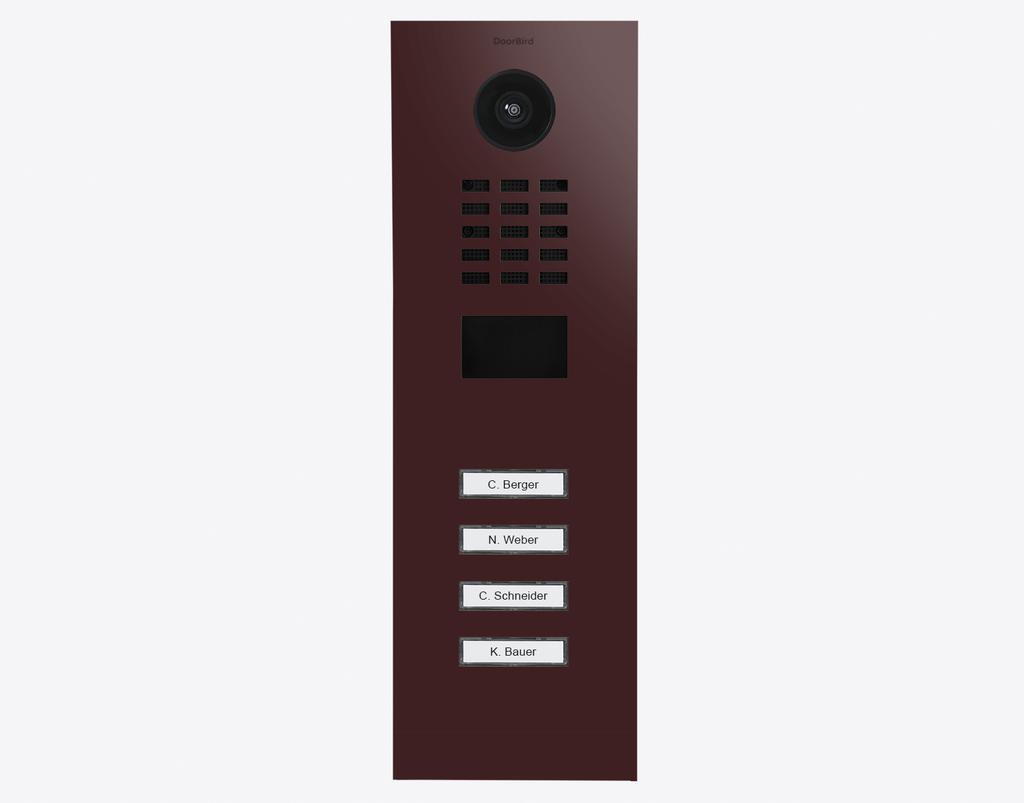 The durable Doorbird D2104V 423886513, IP VIDEO DOOR STATION, RAL 3007, stainless steel, powder-coated, semi-gloss, is for multi-tenant buildings and businesses with 4 units, and 4 call buttons.